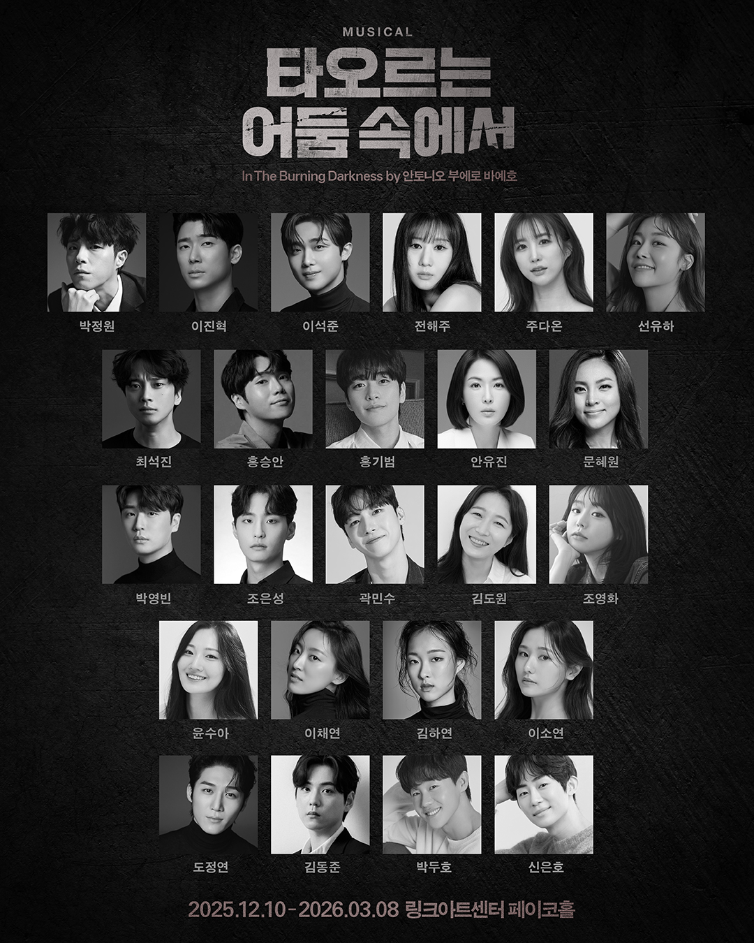 오는 12월 10일(수)부터 2026년 3월 8일(일)까지 링크아트센터 페이코홀에서 공연되는 뮤지컬 ‘타오르는 어둠 속에서는’ 스페인 문학에서 가장 권위 있는 상으로 자리 잡은 미겔 데 세르반테스 상을 비롯하여 국립문학상, 마리아 롤란드상 등을 수상한 안토니오 부에로 바예호의 동명의 희곡을 원작으로 한 작품으로 2023년 초연 당시 만점에 가까운 예매처 관람 평점을 받으며 호평 속에 상연된 바 있다.