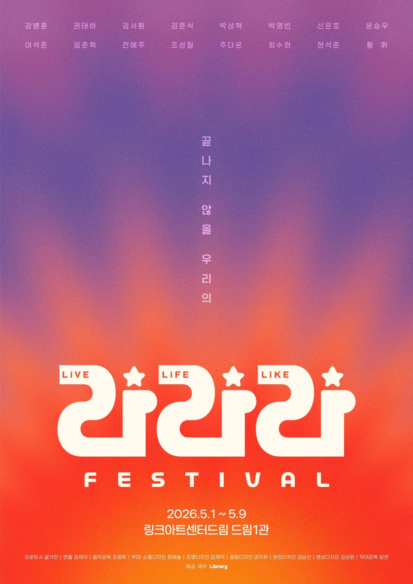 라이브 콘텐츠 기업 라이브러리컴퍼니가 주최하는 뮤지컬 배우 콘서트 ‘라라라 페스티벌’이 오는 5월 1일부터 5월 9일까지 링크아트센터드림 드림1관에서 개막한다.